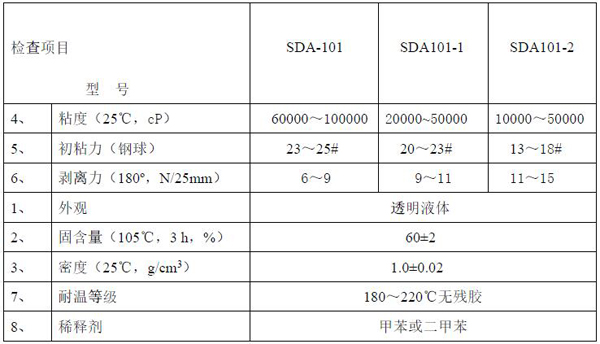 产品应用 SDA-101有机硅电子压敏胶是一种无残渣胶黏剂,用于制备高温下使用的高性能工业用磁带的薄膜和织物的涂胶,还可应用在电绝缘带、电子组合光刻掩模、火焰和等离子喷镀掩蔽、电磁干扰、射频、干扰屏蔽及胶拼等操作上。该产品固含量高、黏度高,具有固化时间短、固化温度低、持粘性强、低烟无毒、不析碳、耐气候性和耐潮湿性优异等特点。 适用于耐高温PET、PI 和美纹纸胶带。
